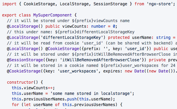 This project started its life as a fork of angular2-storage library. I really like the idea of TypeScript decorators and meta-programming, so I've started to develop ngx-store much further. The main thing this library provides is hiding whole boring logic for saving, reading and parsing data from HTML5' localStorage, sessionStorage and cookies.